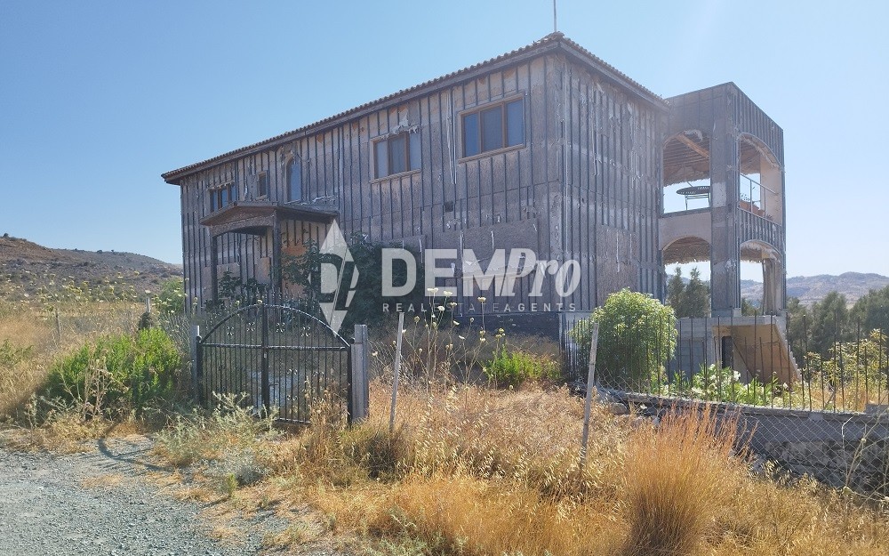 This property is an incomplete four-bedroom house in Anarita, Paphos. The property is located c. 3,2km west of Asprokremmos Reservoir. The house has an area of 300sqm. The ground floor comprises of living room, an open plan dining room and kitchen, a laundry room and a guest toilet. The first floor comprises of four bedrooms (one en-suite), an office and a bathroom. The basement has an area of 215sqm and comprises of storage space, laundry room, a bathroom and parking space. The total land area is 7,491sqm.The immediate area of the property comprises of undeveloped parcels of land. The property falls within agricultural planning zone Γ3 with building density coefficient of 10%, coverage coefficient of 10%, in 2 floors and a maximum height of 8,3m.
